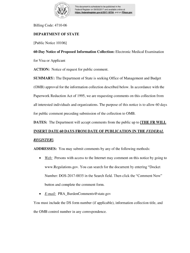 This document is scheduled to be published in the Federal Register on 09/05/2017 and available online at https://federalregister.gov/d/201718704, and on Days. Billing Code: 471006 DEPARTMENT OF STATE