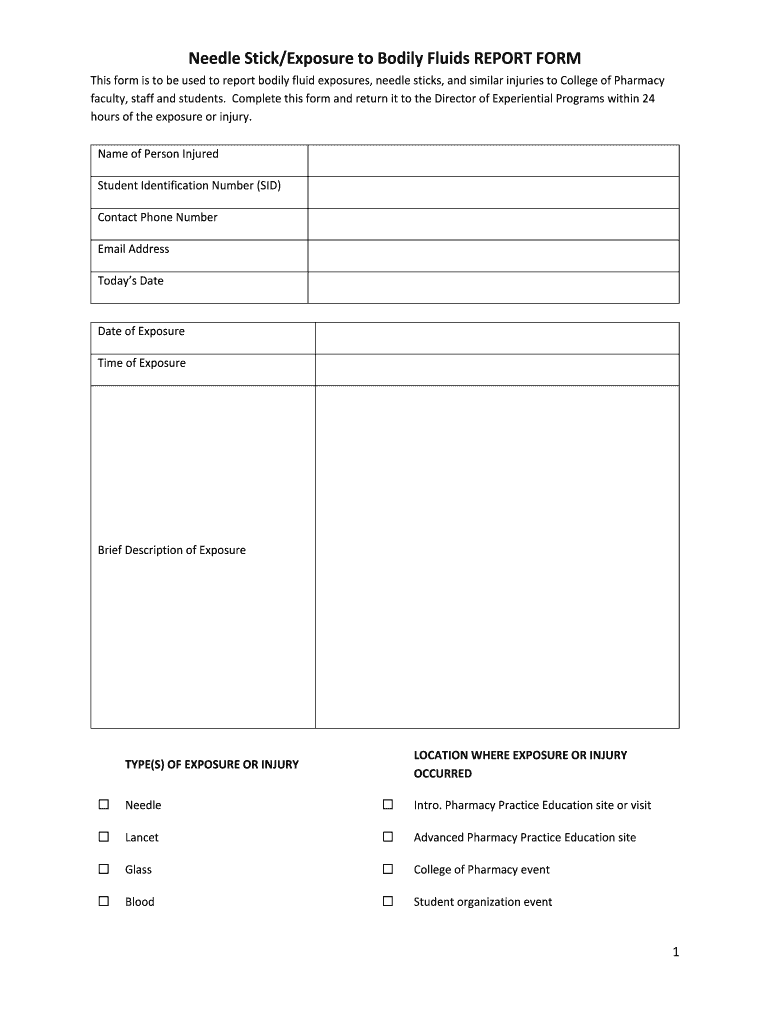 This form is to be used to report bodily fluid exposures, needle sticks, and similar injuries to College of Pharmacy