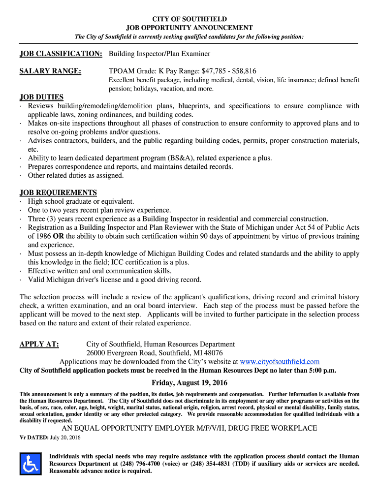 CITY OF SOUTHFIELD JOB OPPORTUNITY ANNOUNCEMENT The City of Southfield is currently seeking qualified candidates for the following position:JOB CLASSIFICATION: Building Inspector/Plan Examiner SALARY