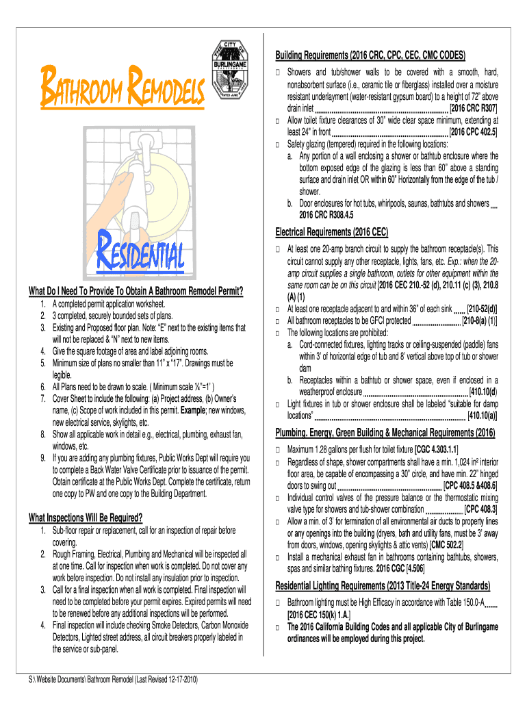 Building Requirements (2016 CRC, CPC, CEC, CMC CODES)BATHROOM REMODELS RESIDENTIALElectrical Requirements (2016 CEC)What Do I Need To Provide To Obtain A Bathroom Remodel Permit? 1. 2. 3. 4. 5. 6.