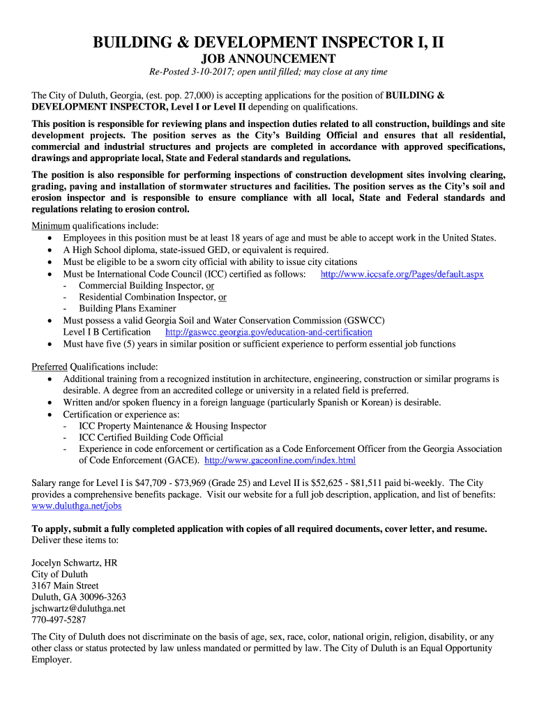 BUILDING & DEVELOPMENT INSPECTOR I, II JOB ANNOUNCEMENT RePosted 3102017; open until filled; may close at any time The City of Duluth, Georgia, (est. pop. 27,000) is accepting applications for the