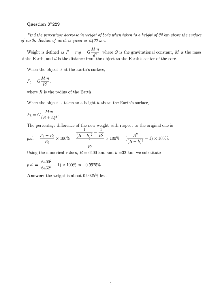Question 37229 Find the percentage decrease in weight of body when taken to a height of 32 km above the surface of earth. Radius of earth is given as 6400 km. Mm, Weight! Is defined as P mg G 2, where