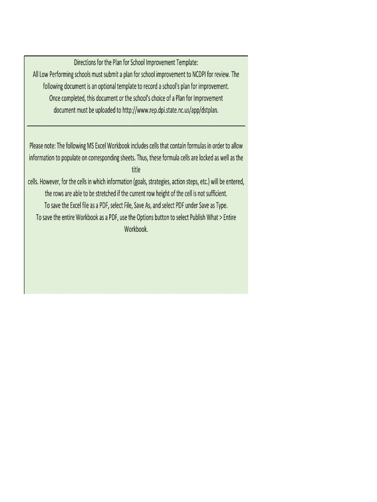 Directions for the Plan for School Improvement Template: All Low Performing schools must submit a plan for school improvement to NCDP for review. The following document is an optional template to
