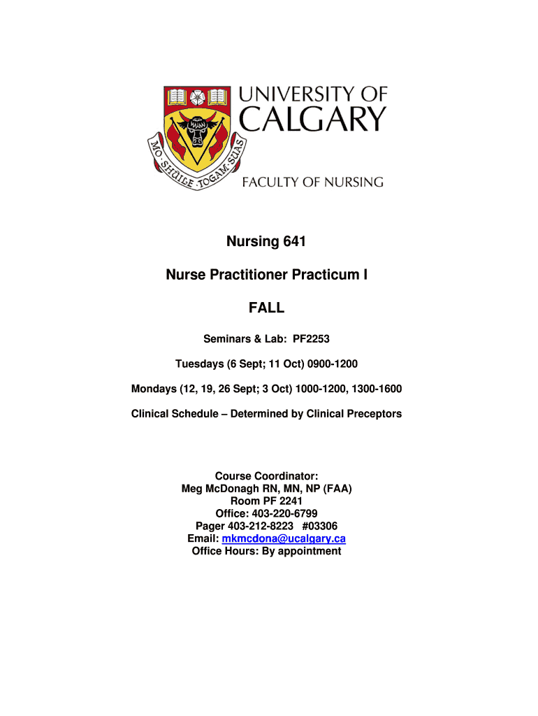 Nursing 641 Nurse Practitioner Practicum I FALL Seminars & Lab: PF2253 Tuesdays (6 Sept; 11 Oct) 09001200 Mondays (12, 19, 26 Sept; 3 Oct) 10001200, 13001600 Clinical Schedule Determined by Clinical