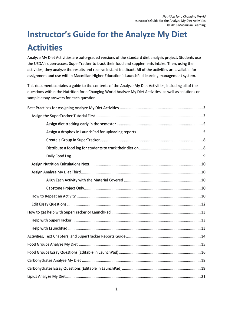 Nutrition for a Changing World Instructors Guide for the Analyze My Diet Activities 2016 Macmillan LearningInstructors Guide for the Analyze My Diet Activities Analyze My Diet Activities are autograded