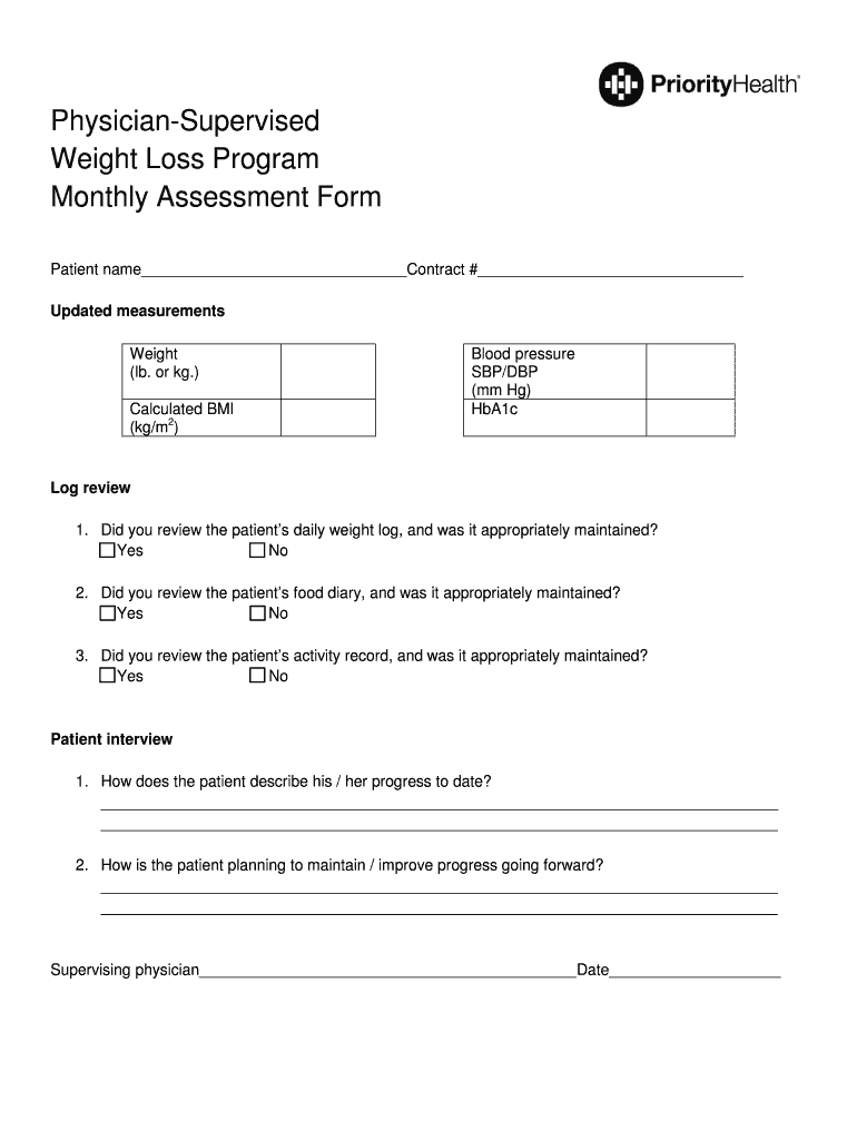 PhysicianSupervised Weight Loss Program Monthly Assessment Forrest Formation name Contract # Updated measurements Weight (lb. or kg.) Calculated BMI (kg/m2)Blood pressure SVP/DBP (mm Hg) HbA1cLog