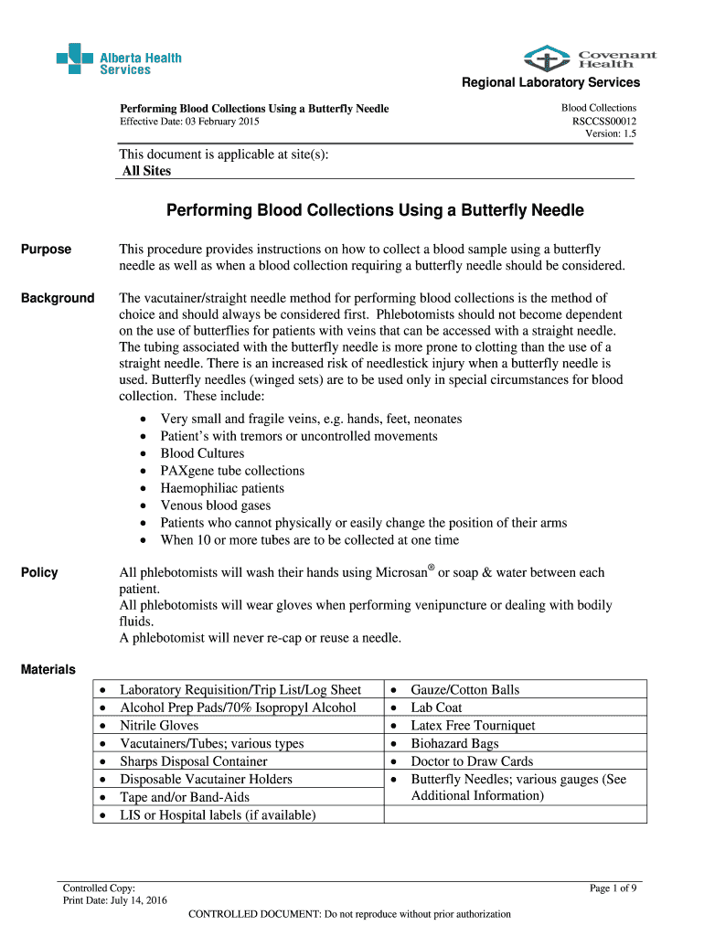 Version: 1.5Performing Blood Collections Using a Butterfly Needle