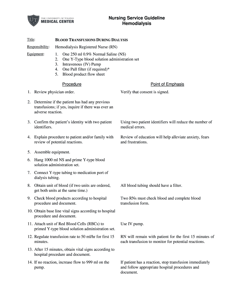 HemodialysisTitle:BLOOD TRANSFUSIONS DURING DIALYSISResponsibility:Hemodialysis Registered Nurse (RN)Equipment:1.
