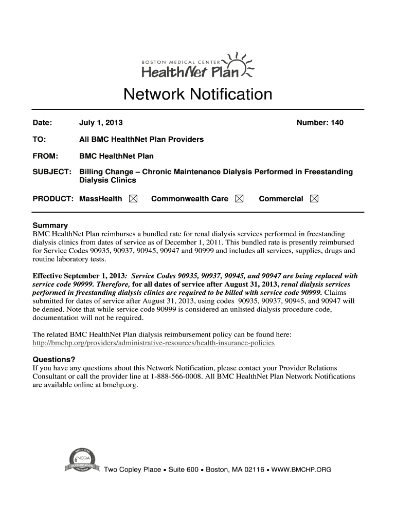 Network Notification Date:July 1, 2013TO:All BMC Healthier Plan ProvidersFROM:BMC Healthier PlanSUBJECT:Billing Change Chronic Maintenance Dialysis Performed in Freestanding Dialysis ClinicsPRODUCT: