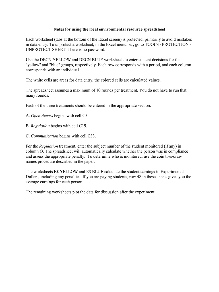 Notes for using the local environmental resource spreadsheet Each worksheet (tabs at the bottom of the Excel screen) is protected, primarily to avoid mistakes in data entry. To protect a worksheet,