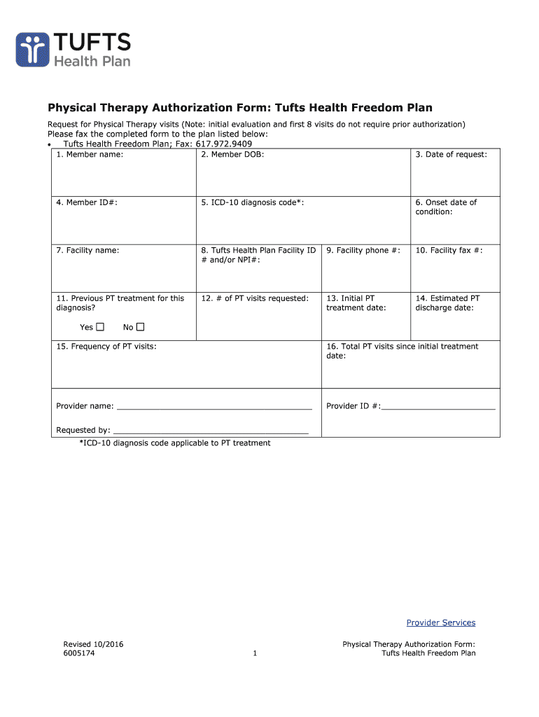 Physical Therapy Authorization Form: Tufts Health Freedom Plan Request for Physical Therapy visits (Note: initial evaluation and first 8 visits do not require prior authorization)Please fax the completed
