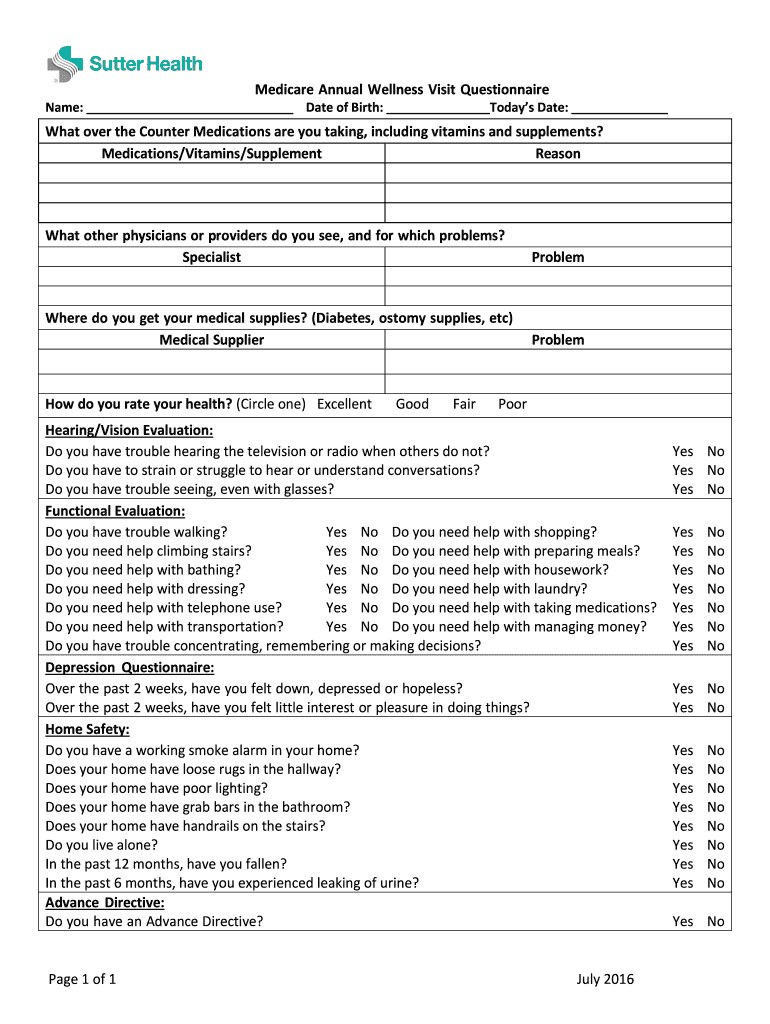 Medicare Annual Wellness Visit QuestionnaireName: Date of Birth: Today's Date: What over the Counter Medications are you taking, including vitamins and supplements? Medications/Vitamins/Supplement