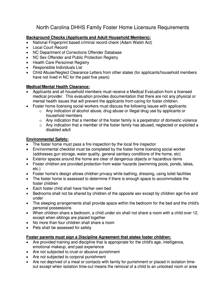 North Carolina HHS Family Foster Home Licensure Requirements Background Checks (Applicants and Adult Household Members): National Fingerprint based criminal record check (Adam Walsh Act) Local Court
