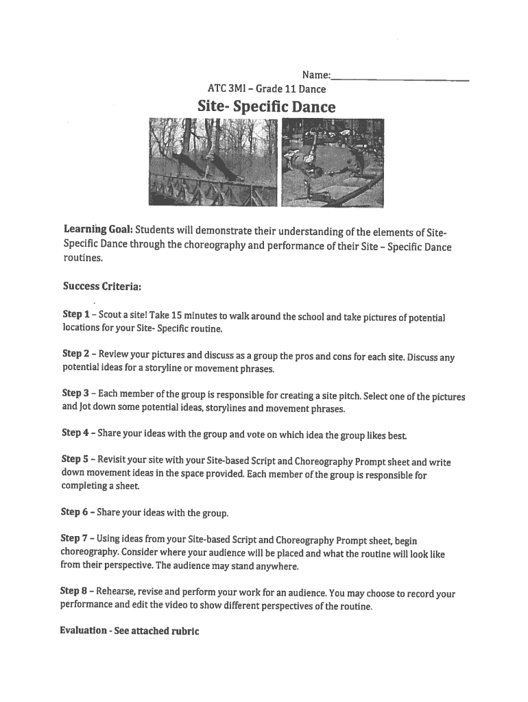 Grade 11 Dance Site Specific DanceLearning Goal: Students will demonstrate their understanding of the elements of Interspecific Dance through the choreography and performance of their