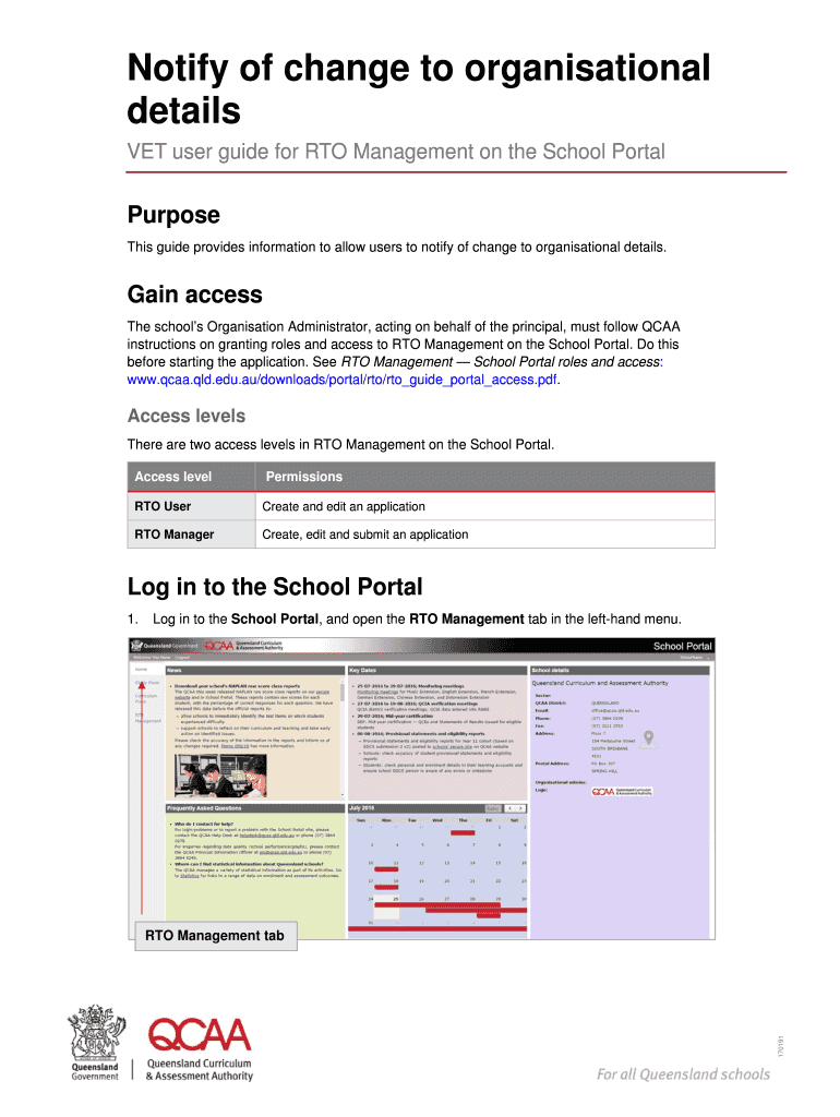 Notify of change to organizational details VET user guide for RTO Management on the School PortalPurpose This guide provides information to allow users to notify of change to organizational details.