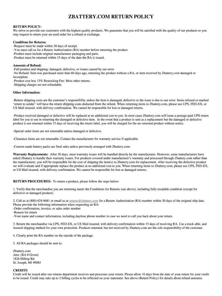 ZBATTERY.COM RETURN POLICY: