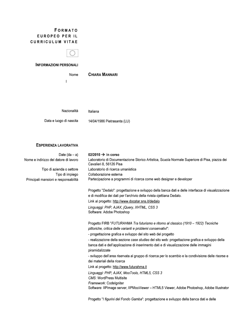 FORMAT EUROPE PER IL CURRICULUM VITAEINFORMAZIONI PERSONAL NomeCHIARA MANNARIINazionalit Data e logo DI nascitaItaliana 14/04/1986 Pietrasanta (LU)ESPERANZA ELABORATIVE Date (the a) Nome e indirizzo
