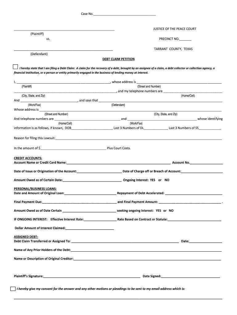 Case No. (Plaintiff) vs. JUSTICE OF THE PEACE COURT (Defendant) DEBT CLAIM PETITIONTARRANT COUNTY, TEXASPRECINCT NO. I hereby state that I am filing a Debt Claim: A claim for the recovery of a debt,
