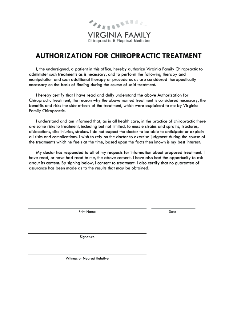 I, the undersigned, a patient in this office, hereby authorize Virginia Family Chiropractic to