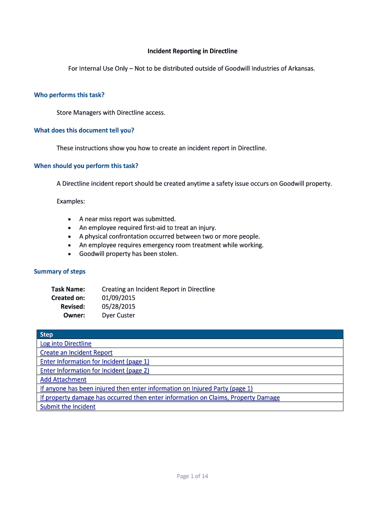 Incident Reporting in Direct line For Internal Use Only Not to be distributed outside of Goodwill Industries of Arkansas. Who performs this task? Store Managers with Direct line access. What does