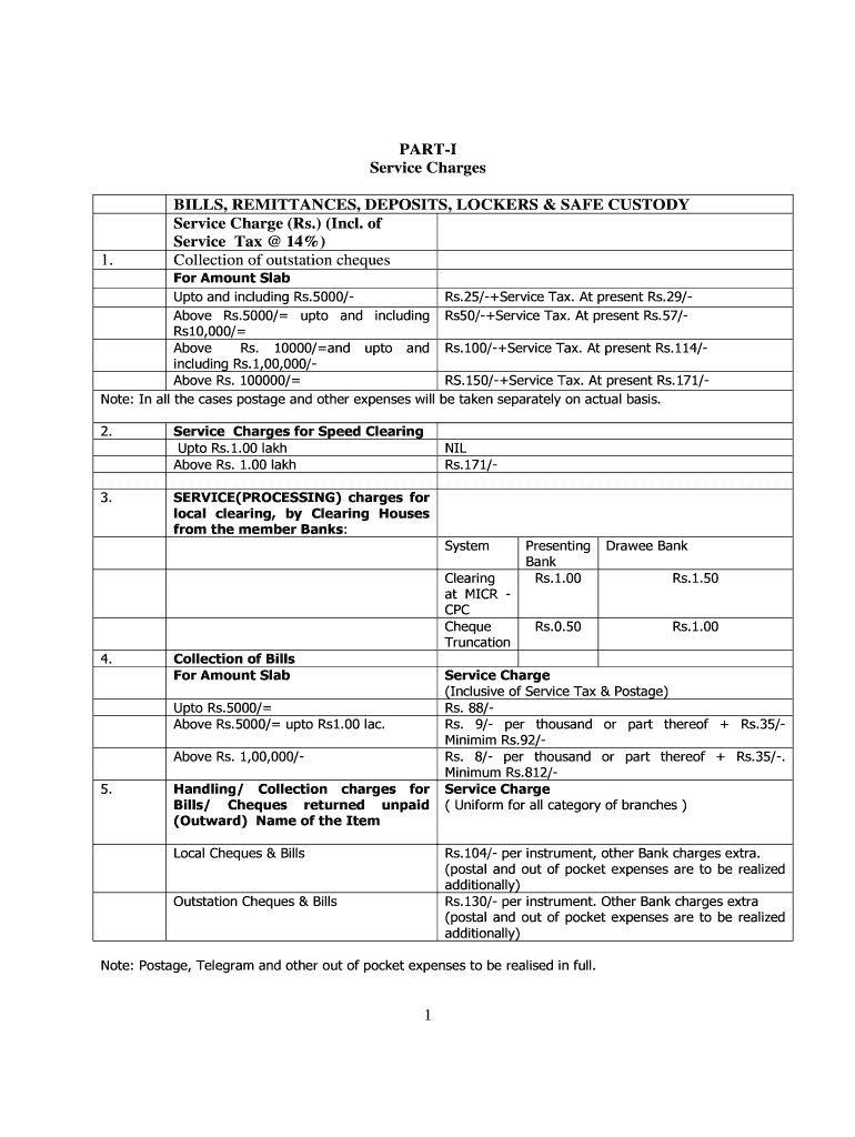 PART Service Charges1.BILLS, REMITTANCES, DEPOSITS, LOCKERS & SAFE CUSTODY Service Charge (Rs.) (Incl. of Service Tax 14%) Collection of outstation requestor Amount Slab Unto and including Rs.5000/Above