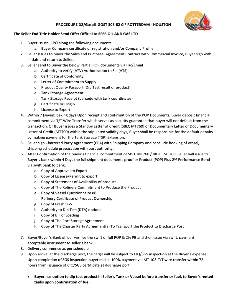PROCEDURE D2/Ga soil MOST 30582 CIF ROTTERDAM HOUSTON The Seller End titleholder Send Offer Official to SAFER OIL AND GAS LTD 1. Buyer issues IPO along the following documents a. Buyer Company certificate