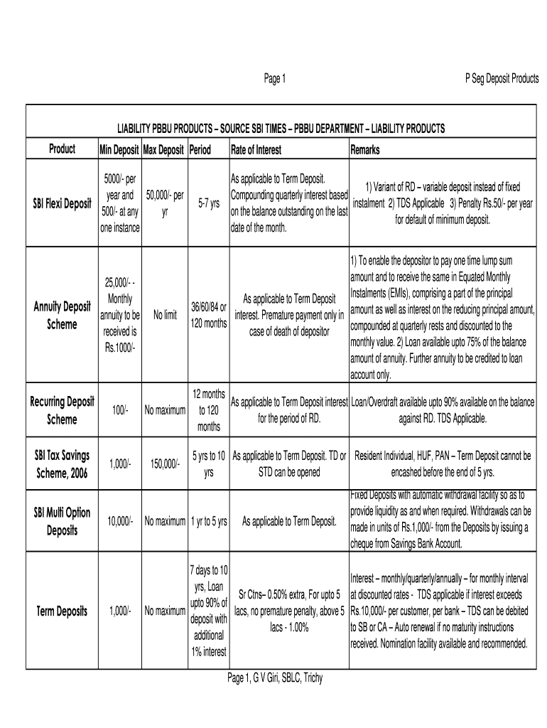 Page 1P SEG Deposit ProductsLIABILITY BBU PRODUCTS SOURCE SBI TIMES BBU DEPARTMENT LIABILITY PRODUCTS Product SBI Flex Deposit Min Deposit Max Deposit Perforate of Interest5000/ per year and 50,000/