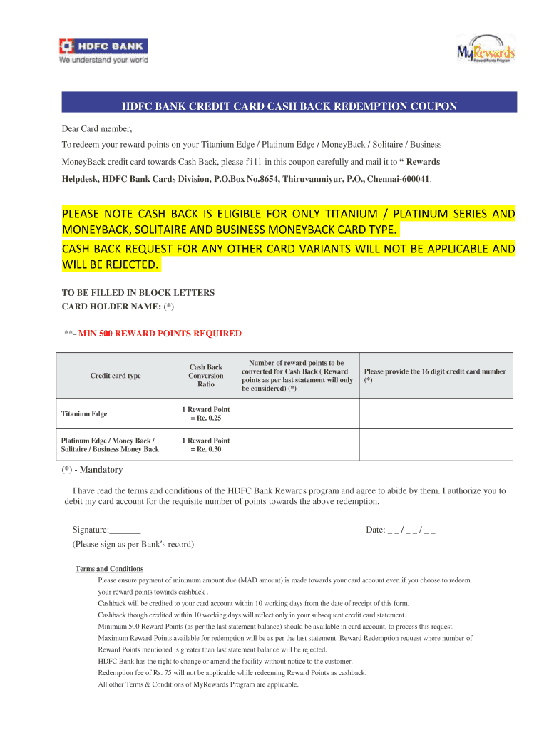HDFC BANK CREDIT CARD CASH BACK REDEMPTION COUPON Dear Card member, To redeem your reward points on your Titanium Edge / Platinum Edge / Money-back / Solitaire / Business Money-back credit card towards