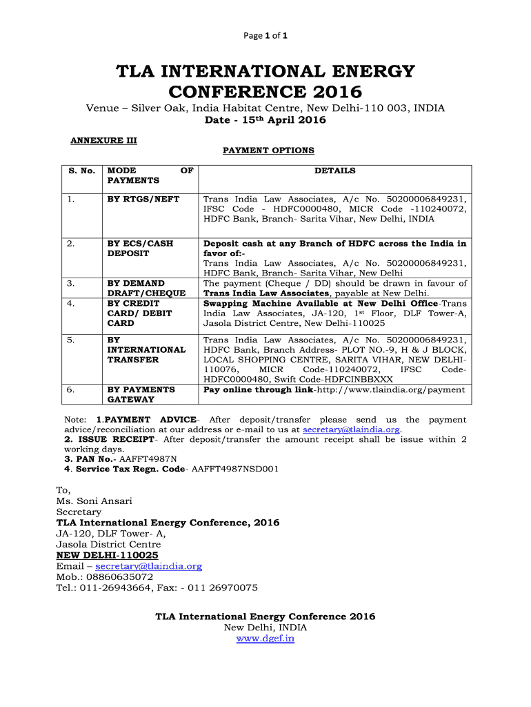 Page 1 of 1TLA INTERNATIONAL ENERGY CONFERENCE 2016 Venue Silver Oak, India Habitat Center, New Delhi110 003, INDIA Date 15th April 2016 Appendix III PAYMENT OPTIONS S. No. MODE PAYMENTS1.BY RTGS/Veterans