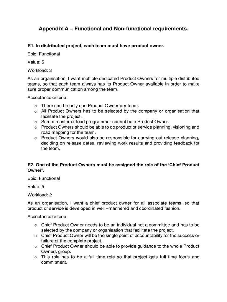 Appendix A Functional and Nonfunctional requirements. R1. In distributed project, each team must have product owner. Epic: Functional Value: 5 Workload: 3 As an organization, I want multiple dedicated