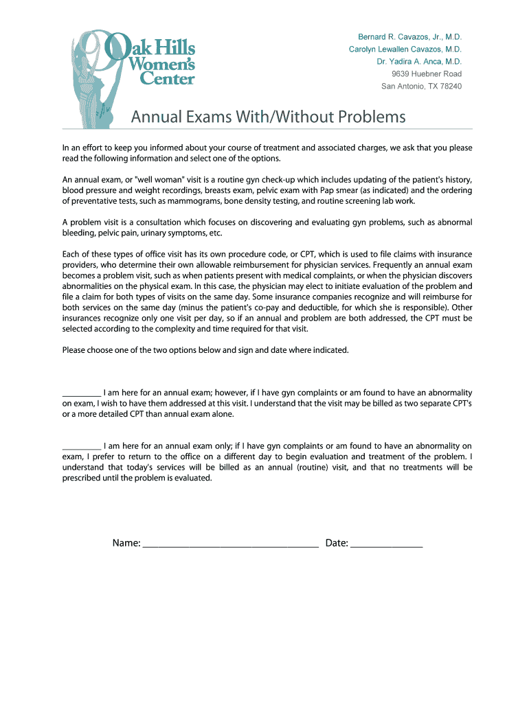 Bernard R. Navajos, Jr., M.D. Carolyn Befallen Navajos, M.D. Dr. Indira A. Anna, M.D. 9639 Huber Road San Antonio, TX 78240Annual Exams With/Without Problems In an effort to keep you informed about