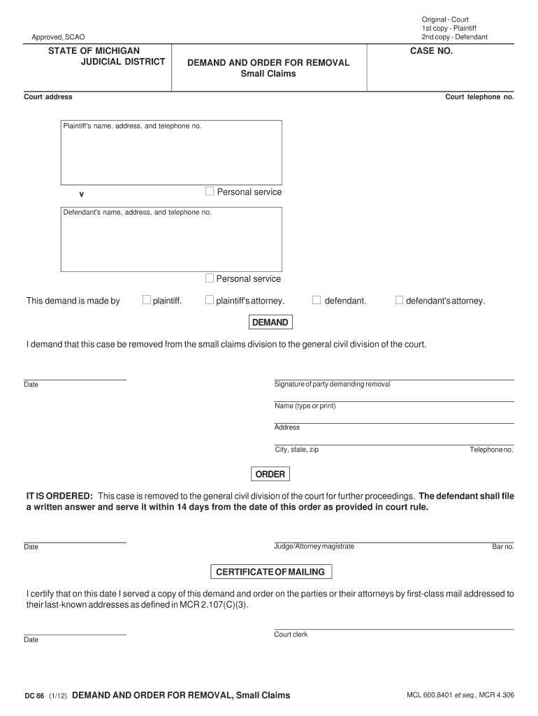 The Demand and Order for Removal is a legal document used by plaintiffs in Michigan to request the transfer of a case from small claims to the general civil division.
