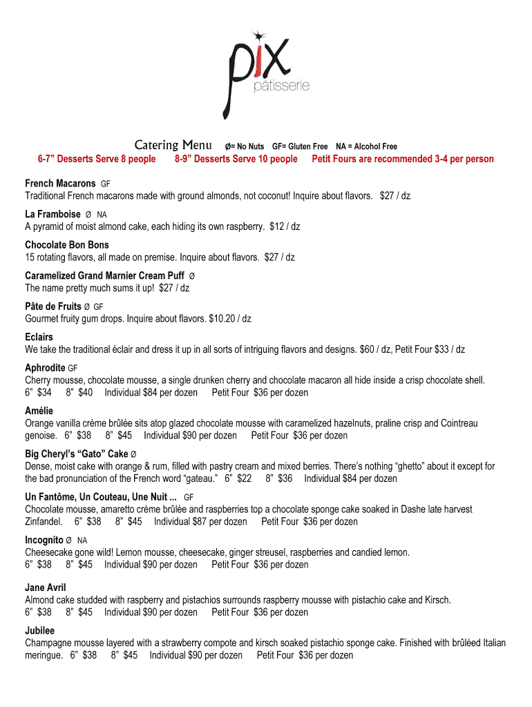 No Nuts GF Gluten Free NA Alcohol Free67 Desserts Serve 8 people89 Desserts Serve 10 peoplePetit Fours are recommended 34 per person French Macarons GF Traditional French macarons made with ground