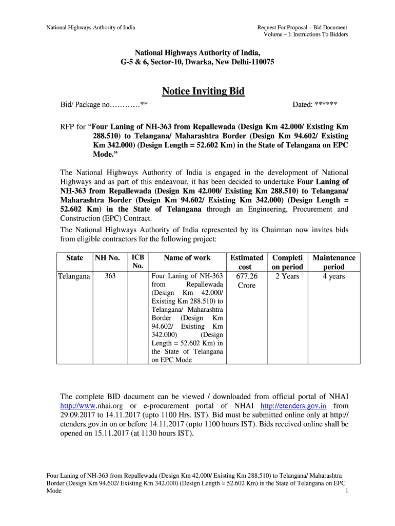 Request For Proposal Bid Document Volume I: Instructions To BiddersNational Highways Authority of Intranational Highways Authority of India, G5 & 6, Sector10, Dark, New Delhi110075Notice Inviting