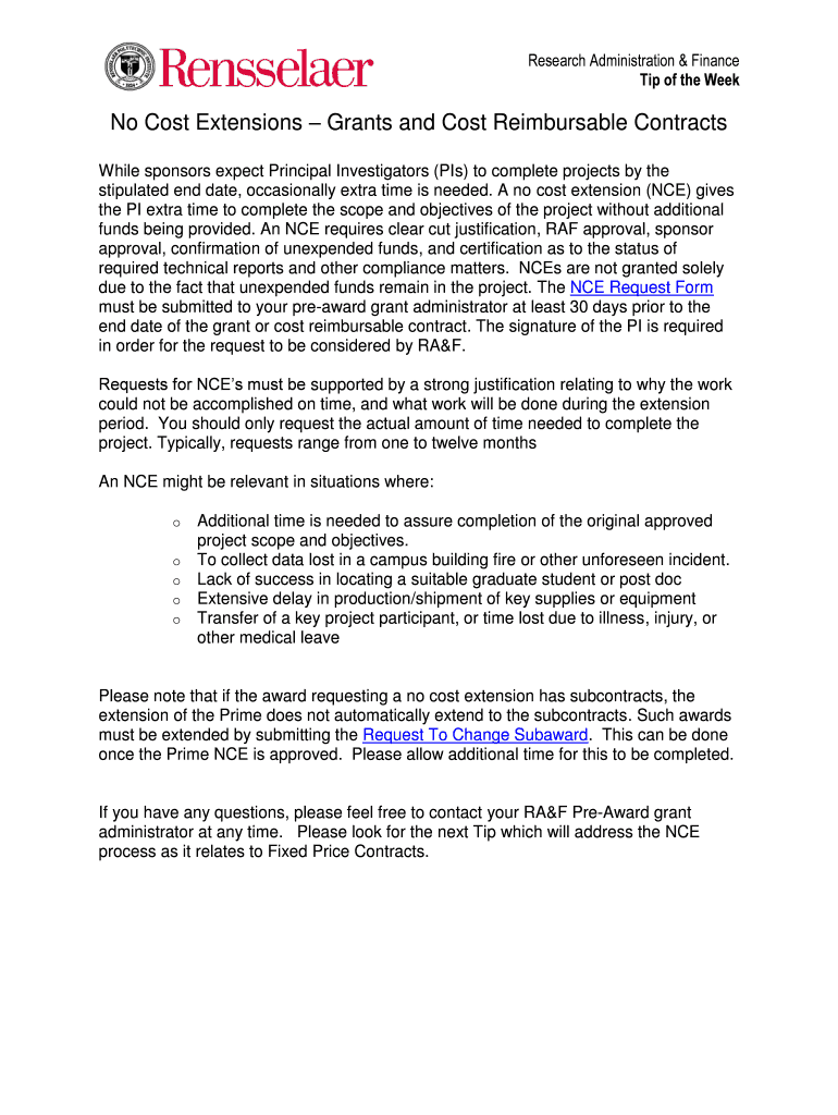 Research Administration & Finance Tip of the Week No Cost Extensions Grants and Cost Reimbursable Contracts While sponsors expect Principal Investigators (PI's) to complete projects by the stipulated