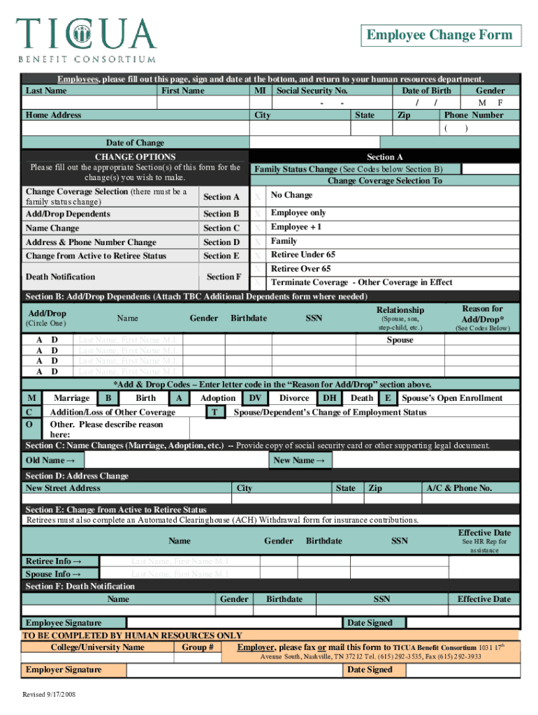 The Employee Change Form is a document used by employees to update their personal information, family status, or coverage selections.