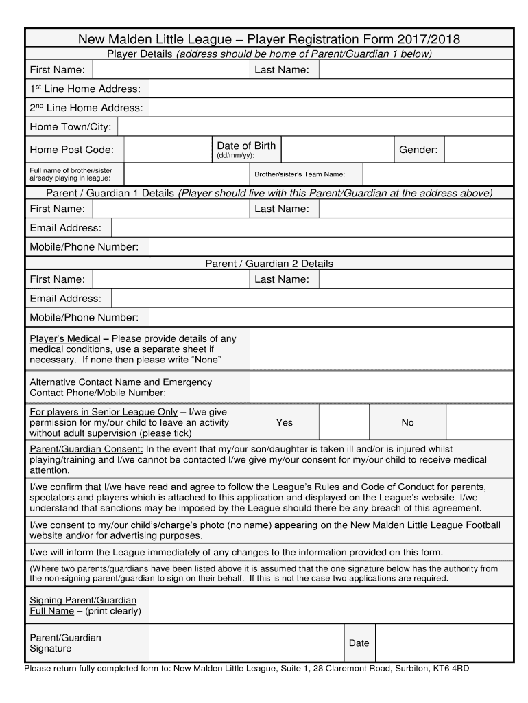New Malden Little League Player Registration Form 2017/2018 Player Details (address should be home of Parent/Guardian 1 below) First Name:Last Name:1st Line Home Address: 2nd Line Home Address: Hometown/City: