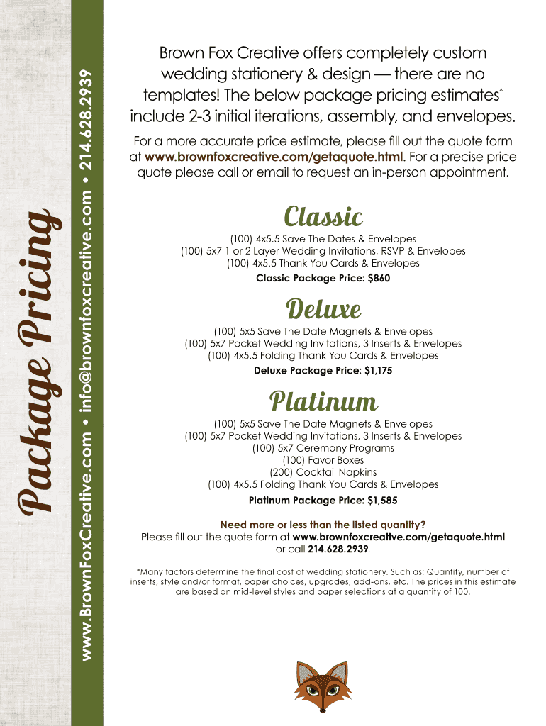 WWW.BrownFoxCreative.com info brownfoxcreative.com 214.628.2939Package Pricing Brown Fox Creative offers completely custom wedding stationery & design there are no templates! The below package pricing