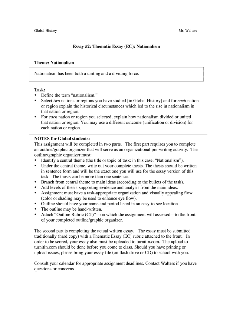 Global History Mr. WaltersEssay #2: Thematic Essay (EC): Nationalism Theme: Nationalism has been both a uniting and a dividing force. Task: Define the term nationalism. Select two nations or regions