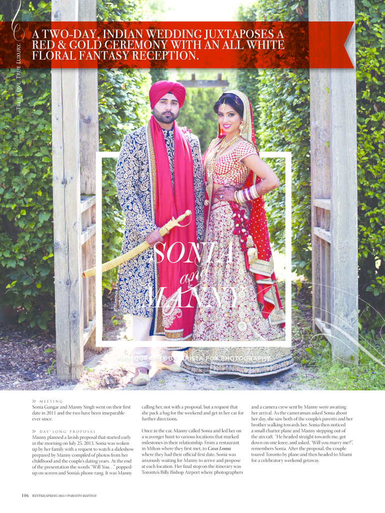 A TODAY, INDIAN WEDDING JUXTAPOSES A RED & GOLD CEREMONY WITH AN WHITE FLORAL FANTASY RECEPTION.SONIA Much PHOTOGRAPHY BY: KRISTA FOX PHOTOGRAPHYmeetingSonia Hangar and Many Singh went on their first