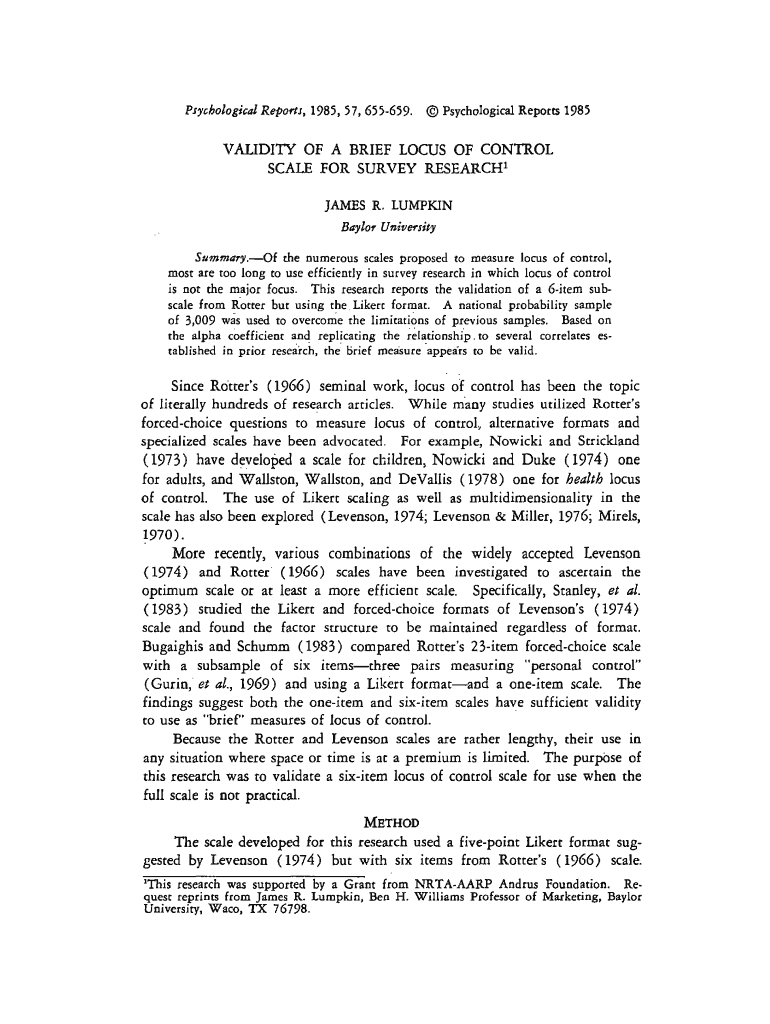 Psychologic Reports, 1985, 57, 655659. PsychologicalReports 1985VALIDITY OF A BRIEF LOCUS OF CONTROL SCALE FOR SURVEY RESEARCH1 JAMES R. LUMPKIN Baylor UniversitySummary. Of the numerous scales proposed