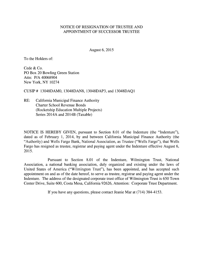 Get the free NOTICE OF RESIGNATION OF TRUSTEE AND