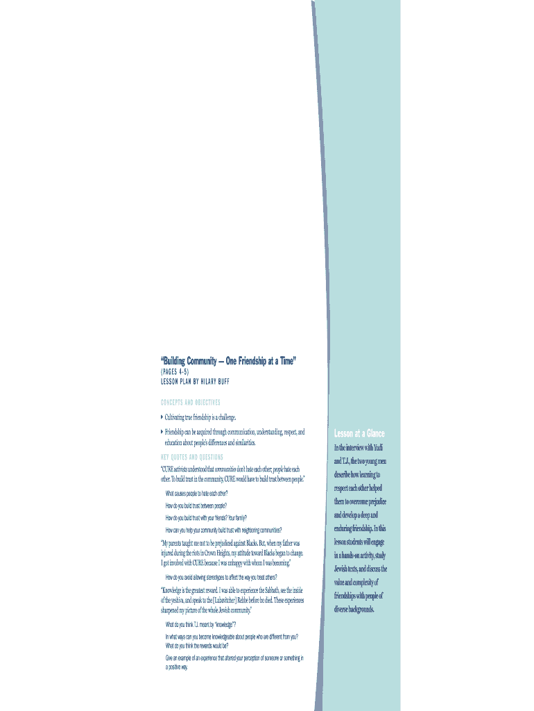 Building Community One Friendship at a Time (PA G E S 4 5) LESSON PLAN BY HILARY BUFF CONCEPTS AND OBJECTIVES k Cultivating true friendship is a challenge. K Friendship can be acquired through communication,