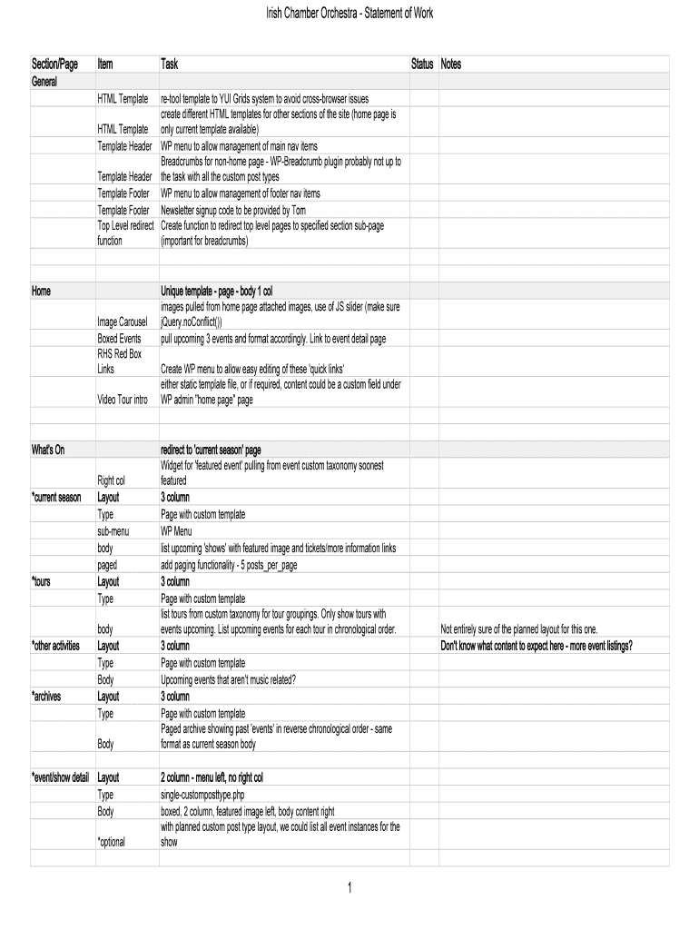 Irish Chamber Orchestra Statement of Work Section/PageItemTaskStatus NotesGeneral HTML Template retool template to GUI Grids system to avoid cross browser issues create different HTML templates for