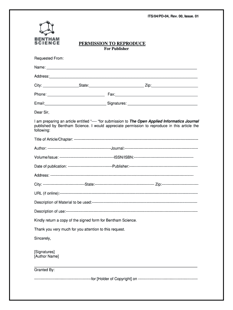 ITS/04/PD-04, Rev. 00, Issue. 01 PERMISSION TO REPRODUCE For Publisher Requested From: Name: Address: City: State: Zip: Phone: Fax: Email: Signatures: Dear Sir, I am preparing an article entitled