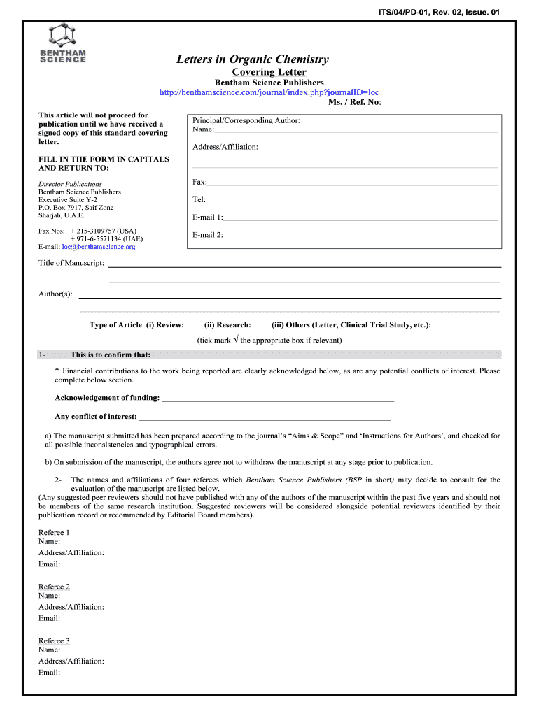 The Bentham Science Publishers Covering Letter includes several important components. Key features of this form are: