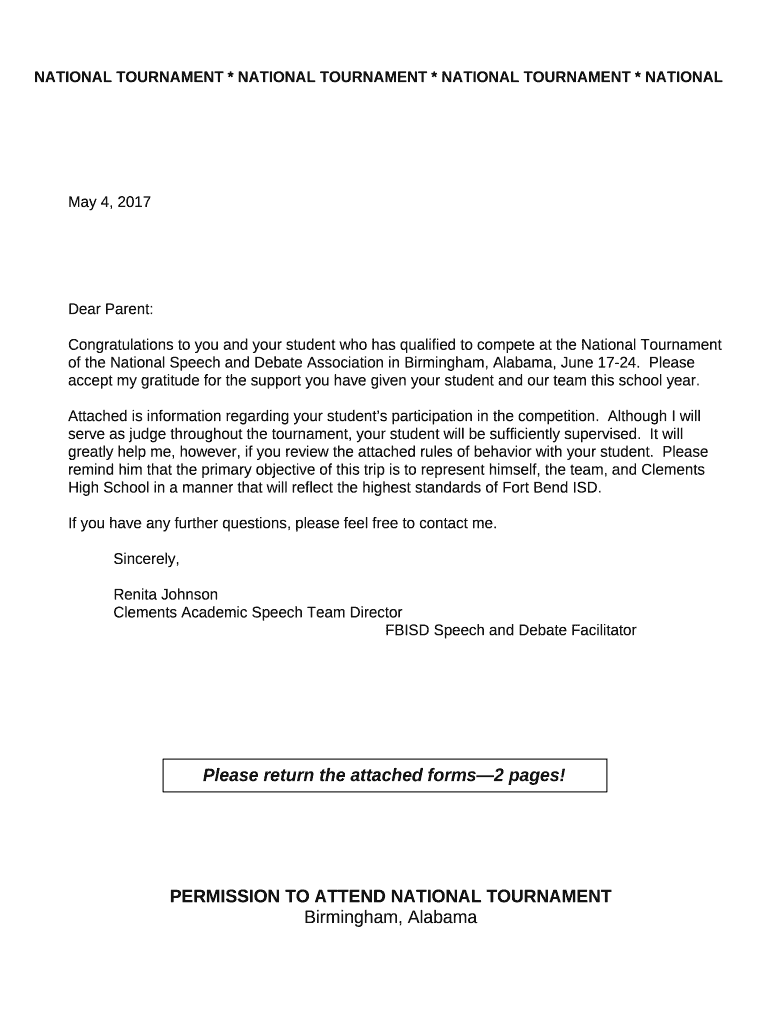 NATIONAL TOURNAMENT * NATIONAL TOURNAMENT * NATIONAL TOURNAMENT * NATIONAL May 4, 2017Dear Parent:Congratulations to you and your student who has qualified to compete at the National Tournament of