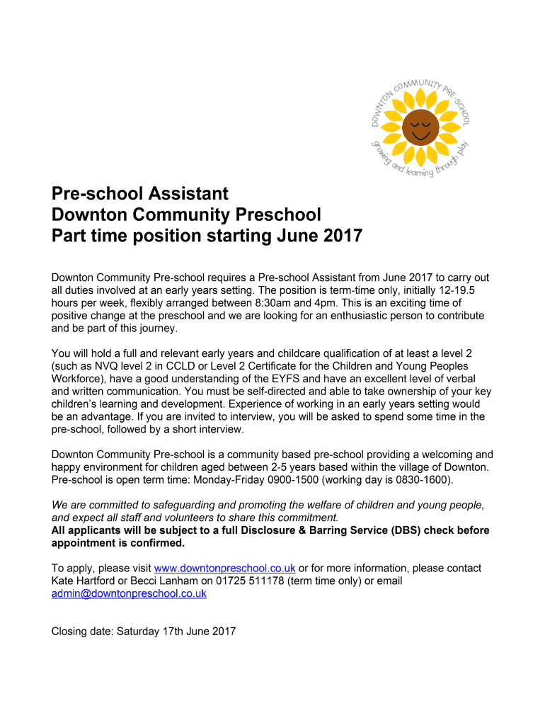 Guide to Application Pack 1.) Read and Retain Covering letter Job Description Person Specification Prospectus Safeguarding Statement2.) Complete/Sign and Return Self disclosure Form Application FormPreschool