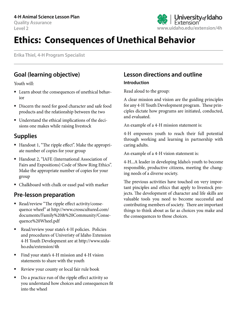 4H Animal Science Lesson Plan Quality Assurance Level 2www.uidaho.edu/extension/4hEthics: Consequences of Unethical Behavior Erika Thiel, 4H Program SpecialistGoal (learning objective)Lesson directions