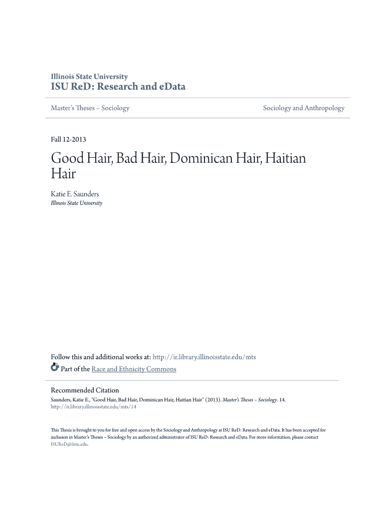 Illinois State University Red: Research and data Master’s Theses SociologySociology and Anthropological 122013Good Hair, Bad Hair, Dominican Hair, Haitian Hair Katie E. Saunders Illinois State UniversityFollow